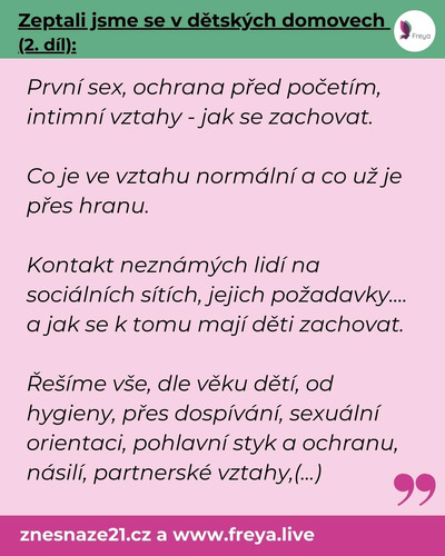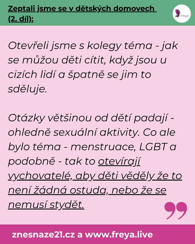 „Otevřeli jsme si s kolegy téma - jak se můžou děti cítit, když jsou u cizích lidí a špatně se jim to sděluje. Otázky většinou od dětí padají - ohledně sexuální aktivity. Co ale bylo téma - menstruace, LGBT a podobně - tak to otevírají vychovatelé, aby děti věděly že to není žádná ostuda, nebo že se nemusí stydět.”