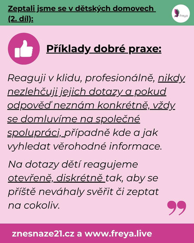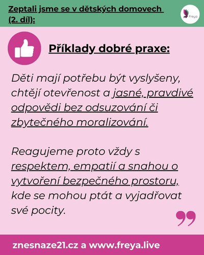 „Děti mají potřebu být vyslyšeny, chtějí otevřenost a jasné, pravdivé odpovědi bez odsuzování či zbytečného moralizování. Reagujeme proto vždy s respektem, empatií a snahou o vytvoření bezpečného prostoru, kde se mohou ptát a vyjadřovat své pocity.”