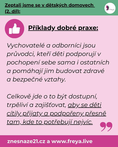 Ne všude je však citlivá a respektující práce s potřebami dětí v oblasti poznání své sexuality a zdravých vztahů samozřejmostí. V mnoha dětských domovech je sexualita stále tabu a personál potřebuje vzdělání a podporu, aby věděl, jak o ní mluvit a předávat relevantní informace bez předsudků.